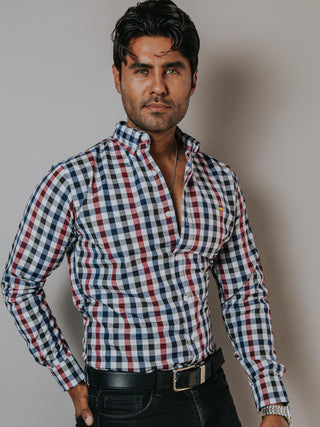 Camisa Hombre Casual Color Hueso Líneas Azul y Rojo