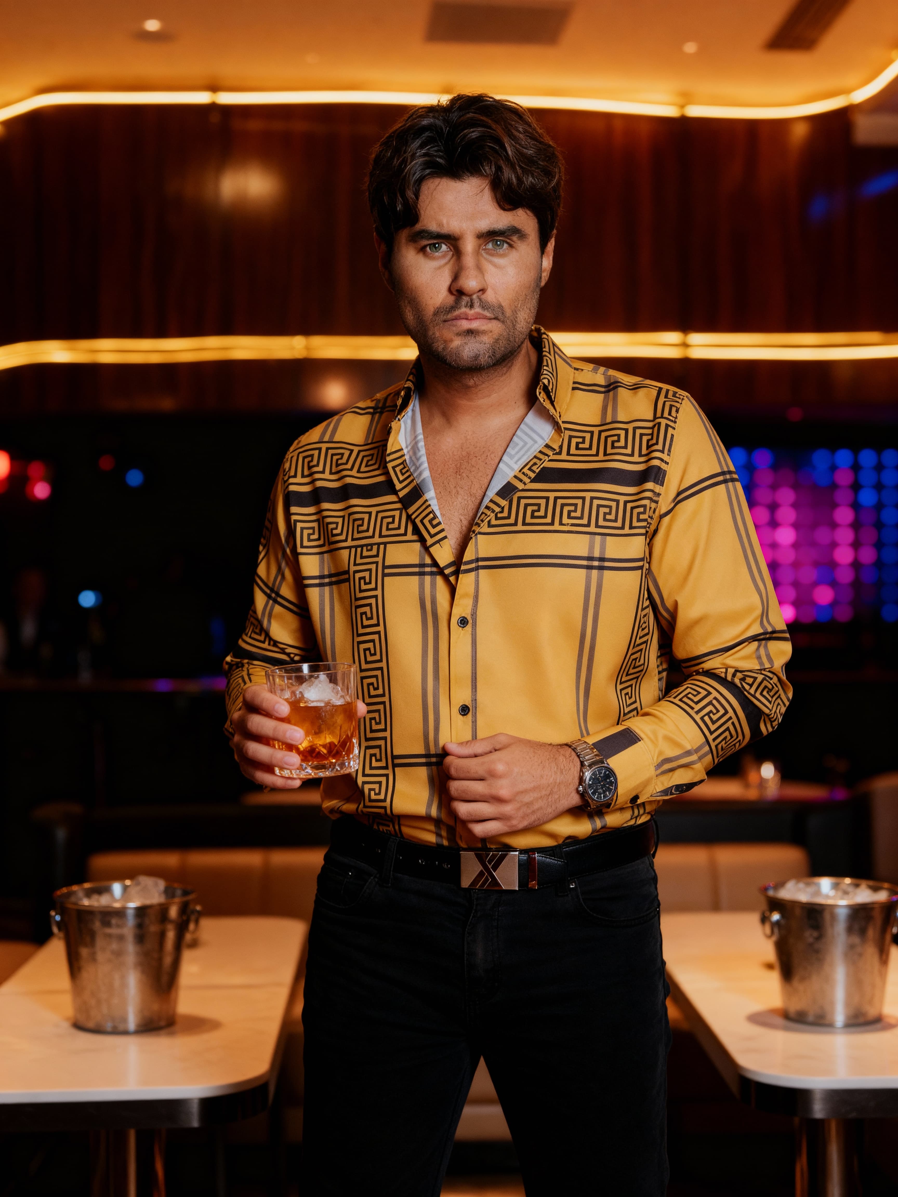 Camisa Hombre Casual Mostaza Grecas Gris y Negro
