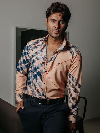 Camisa Hombre Casual Melón Cuadros Azul Marino Línea Roja