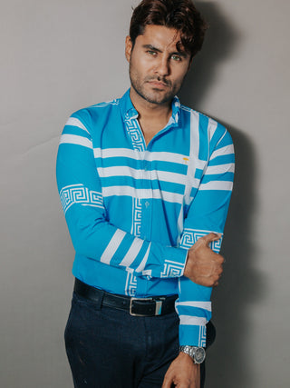 Camisa Hombre Casual Azul Cielo Detalle Griego Blanco