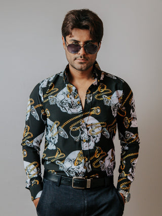 Camisa Hombre Casual Negra Calaveras Blancas Cadenas